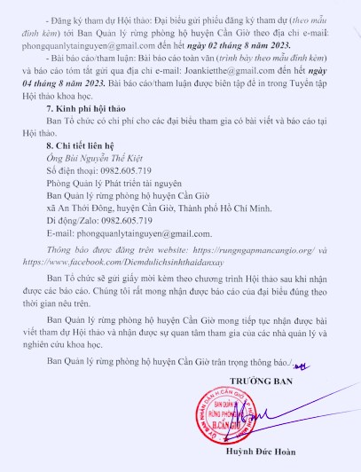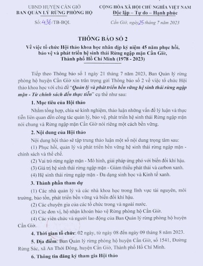 Tổ chức Hội thảo khoa học nhân dịp Kỷ niệm 45 năm phục hồi, bảo vệ và phát triển hệ sinh thái Rừng ngập mặn Cần Giờ, Thành phố Hồ Chí Minh (1978 - 2023).