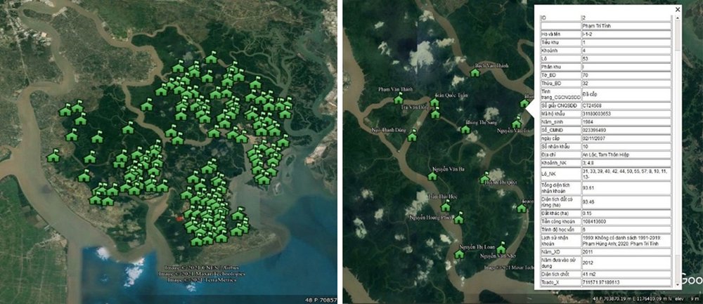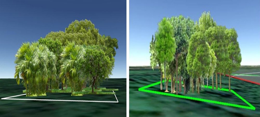 Mô hình phân bố cây rừng trên phần mềm Google Earth, hình ảnh được thể hiện đúng tỷ lệ theo kích thước thực tế của cây rừng về: Đường kính thân cây, chiều cao cây rừng... được cập nhật từ dữ liệu điều tra.